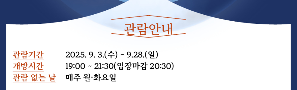 - 관람 시간: 오후 7시 ~ 9시 30분, 마지막 입장 8시 30분