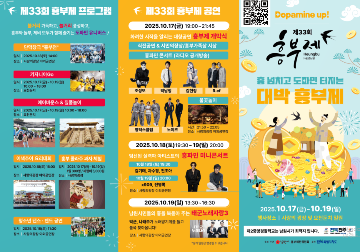 제33회 남원 흥부제가 드디어 돌아옵니다! 2025년 10월 17일(금)부터 19일(일)까지, 흥부전의 고향 전북 남원시에서 열리는 이번 축제는 “우애, 나눔, 보은, 그리고 행운”을 주제로 남원의 정체성과 흥부정신을 되살리는 대표 가을 축제입니다.