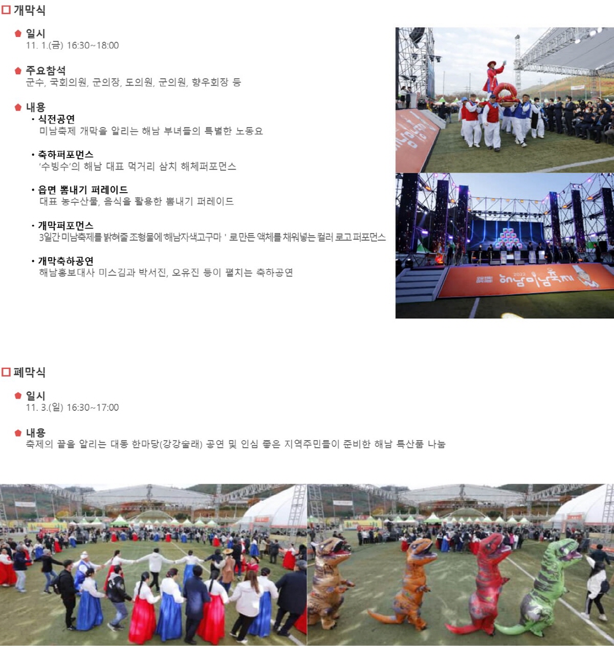 - 개막공연: 해남예술단 축하무대 + 지역 초대가수 공연
